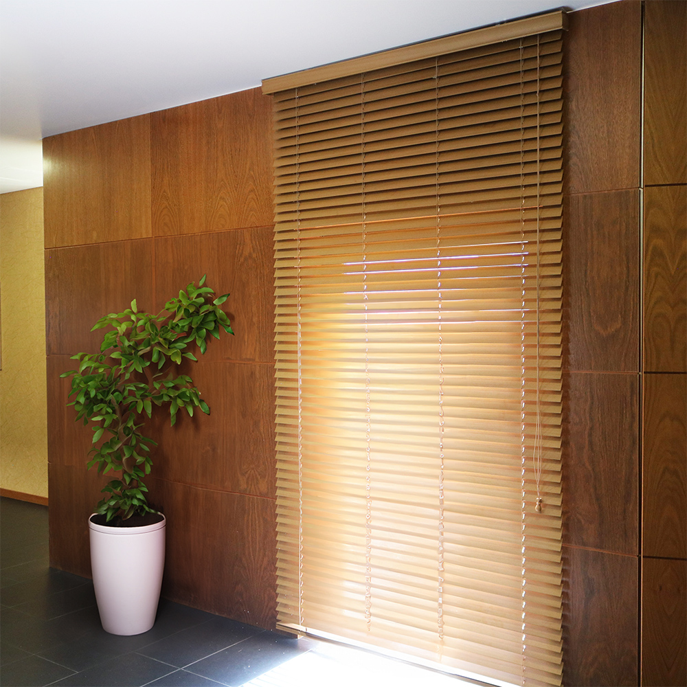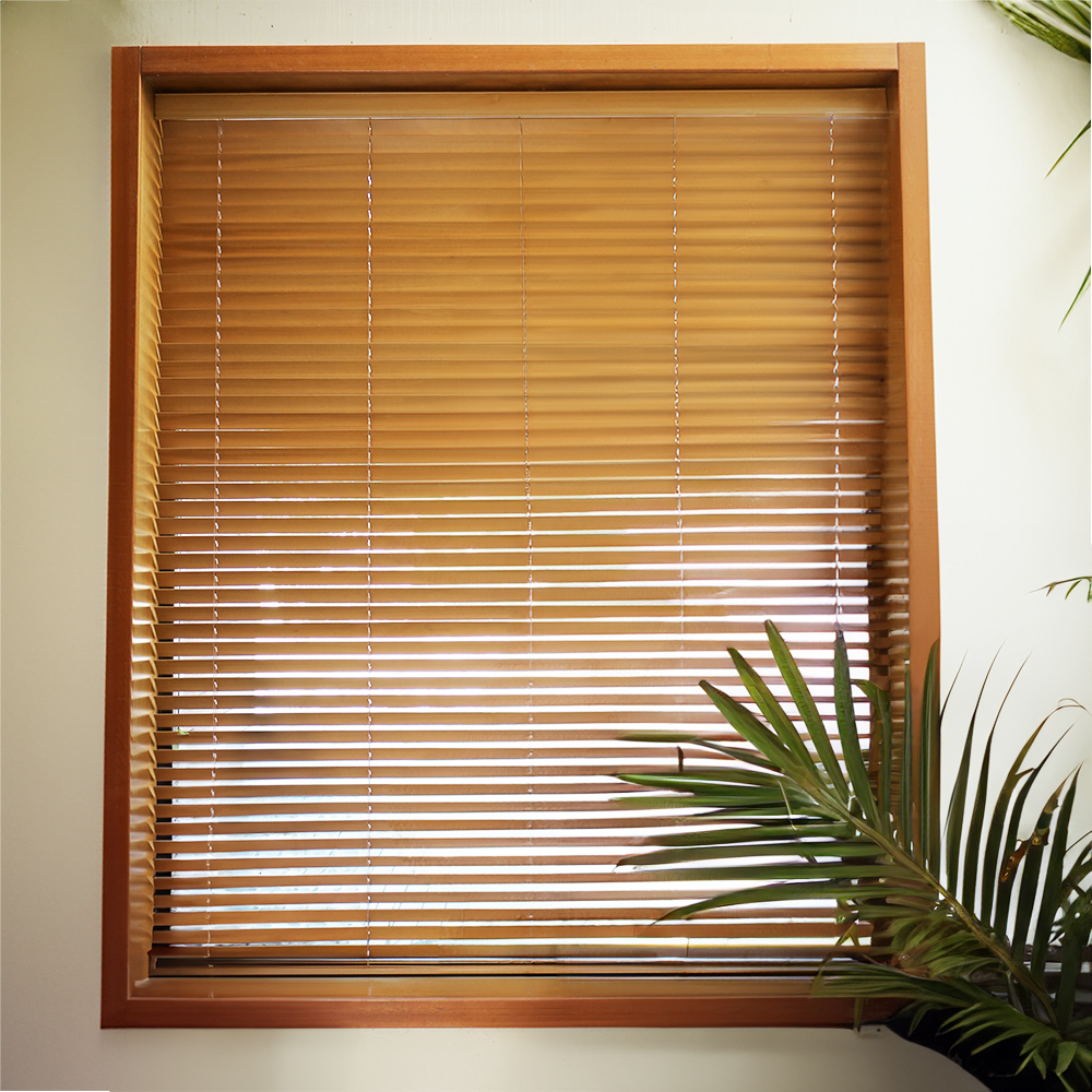 Estore em lâminas horizontais de Madeira exótica de fibra compacta e muito densa, com espessura que varia entre os 2-3 mm. Apresenta uma grande estabilidade às variações de temperatura e luz, bem como qualidades como protetor acústico. Este produto é um isolamento natural que incrementa a eficácia da energia em 23 %.